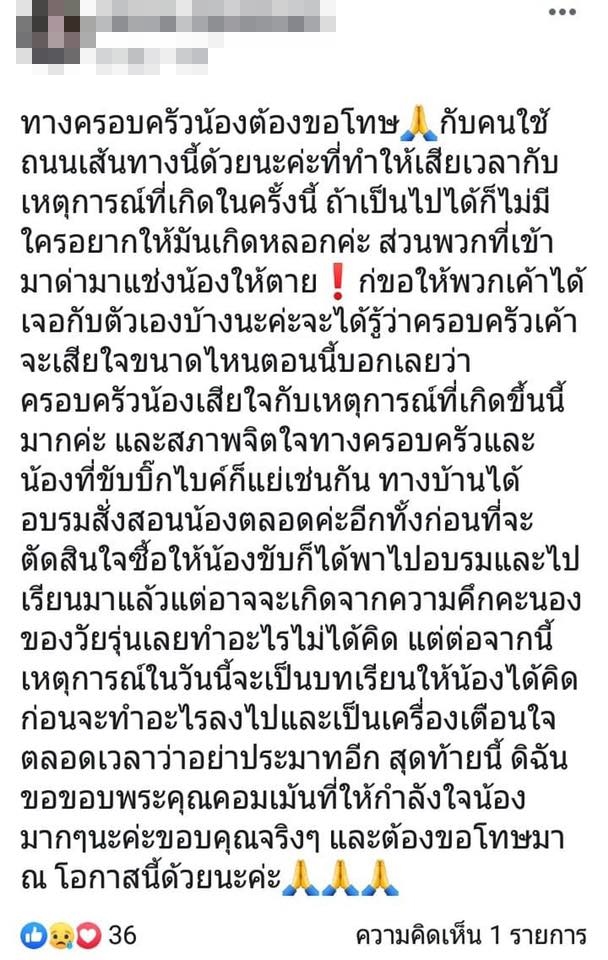 ต่อมาทางแฟนเพจ กระโหลกแดง ได้โพสต์ข้อความจากครอบครัวของเด็กชายคนดังกล่าว ที่โพสต์ลงในเฟซบุ๊ก ระบุว่า "ทางครอบครัวน้องต้องขอโทษกับคนใช้ถนนเส้นทางนี้ด้วยนะคะ ที่ทำให้เสียเวลากับเหตุการณ์ที่เกิดในครั้งนี้ ถ้าเป็นไปได้ก็ไม่มีใครอยากให้มันเกิดหรอกค่ะ ส่วนพวกที่เข้ามาด่ามาแช่งน้องให้ตาย ก็ขอให้พวกเขาได้เจอกับตัวเองบ้างนะคะ จะได้รู้ว่าครอบครัวเขาเสียใจขนาดไหน ตอนนี้บอกเลยว่า ครอบครัวน้องเสียใจกับเหตุการณ์ที่เกิดขึ้นนี้มากค่ะ และสภาพจิตใจทางครอบครัวและน้องที่ขี่บิ๊กไบค์ก็แย่เช่นกัน ทางบ้านได้อบรมสั่งสอนน้องตลอดค่ะ