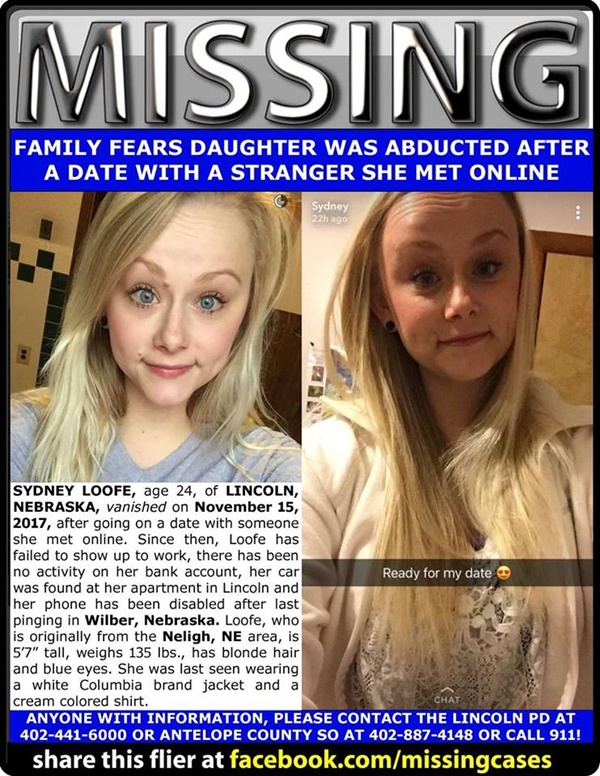 เหตุการณ์สะเทือนขวัญดังกล่าวเกิดขึ้นที่เมืองโอมาฮา รัฐเนแบรสกา เมื่อ 2 ปีที่แล้ว แต่คดีความยังคงยืดเยื้อไม่จบสิ้น โดยในเดือนพฤศจิกายน 2560 ซิดนีย์ ได้รู้จักกับ ออเบรย์ เทรล ชายวัย 52 ปี ผ่านทางแอปฯ ทินเดอร์ (Tinder) และหลังจากพูดคุยกันมาหลายสัปดาห์ ทั้งคู่ก็นัดพบกัน ซึ่งก่อนที่ซิดนีย์จะออกจากบ้าน เธอได้ถ่ายภาพเซลฟี่ลงบนโซเชียลมีเดีย ระบุแคปชั่นว่า "พร้อมเจอคู่เดตแล้ว" และนั่นแทบจะเป็นความเคลื่อนไหวสุดท้ายของเธอบนสังคมออนไลน์ ต่อมาในวันรุ่งขึ้น แม่ของซิดนีย์ก็พบความผิดปกติ เพราะลูกสาวหายตัวไป ไม่กลับบ้าน ไม่ไปทำงาน แถมติดต่อไม่ได้ เธอจึงเข้าแจ้งความคนหาย