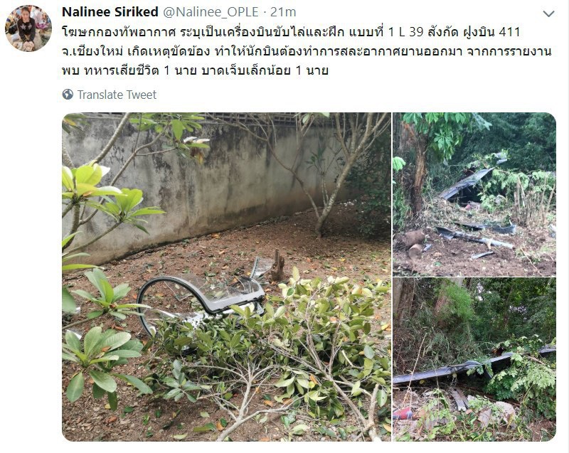 โดยมีรายงานว่า โฆษกกองทัพอากาศ ระบุว่า เครื่องบินดังกล่าวเป็นเครื่องบินขับไล่และฝึก แบบที่ 1 L 39 สังกัด ฝูงบิน 411 จ.เชียงใหม่ เกิดเหตุขัดข้อง ทำให้นักบินต้องทำการสละอากาศยานออกมา