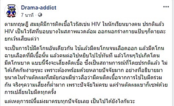 เกี่ยวกับเรื่องนี้ เพจเฟซบุ๊ก Drama-addict ได้ให้ความรู้กรณีที่มีความกังวลเรื่องติดเชื้อ HIV ผ่านการโกนหนวดด้วยใบมีดเดียวกัน ระบุว่า ตามทฤษฎี สมมติมีการติดเชื้อไวรัส เช่น HIV ในนักเรียนบางคน ปกติแล้ว HIV เป็นไวรัสที่บอบบางในสภาพแวดล้อม ออกนอกร่างกายไม่นานก็จะตาย กรณีที่เสี่ยงนั้นต้องเป็นการโกนจนเลือดออกแล้วอีกคนหยิบไปใช้ทันที และถือว่ามีความเสี่ยงต่ำที่จะเกิดขึ้น อย่างไรก็ดี ก็ไม่ควรมีกรณีการปล่อยให้ใช้ใบมีดโกนร่วมกันแบบนี้เช่นกัน