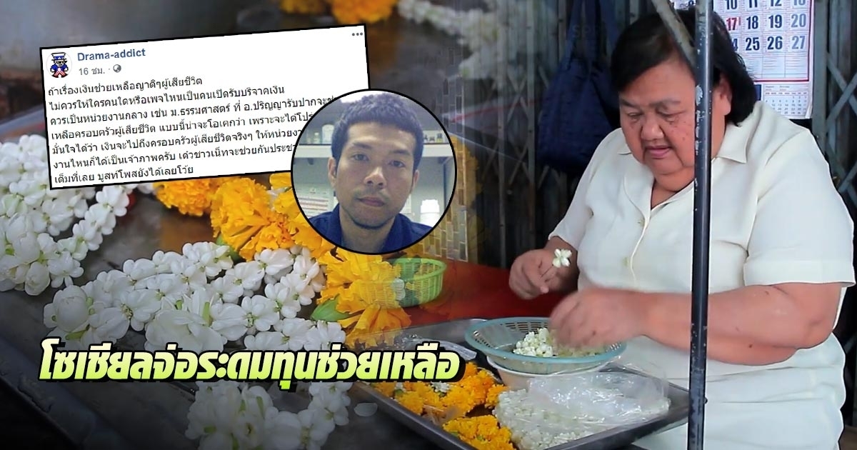 ขณะที่ เพจเฟซบุ๊ก Drama-addict กล่าวถึงเรื่องนี้ โดยเสนอความเห็น ระบุว่า "การเปิดบัญชีระดมทุนนั้น ไม่ควรให้ใครคนใด หรือเพจไหนเป็นคนเปิดรับบริจาคเงิน แต่ควรเป็นหน่วยงานกลาง เช่น ม.ธรรมศาสตร์ ที่ อ.ปริญญา รับปากจะช่วยเหลือครอบครัวผู้เสียชีวิต แบบนี้น่าจะโอเคกว่า เพราะจะได้โปร่งใส และมั่นใจได้ว่า เงินจะไปถึงครอบครัวผู้เสียชีวิตจริง ๆ ให้หน่วยงานกลางหน่วยงานไหนก็ได้เป็นเจ้าภาพครับ เดี๋ยวชาวเน็ตจะช่วยกันประชาสัมพันธ์กันแบบเต็มที่เลย บูสต์โพสต์ยังได้เลยโว้ย"