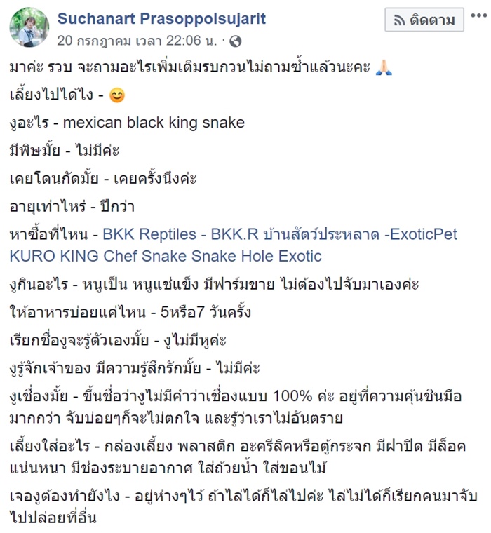 เกี่ยวกับเรื่องนี้ เมื่อวันที่ 20 กรกฎาคม 2562 นางสาวสุชานาถ ประสพผลสุจริต เจ้าของงู ได้มีการโพสต์ข้อความผ่านเฟซบุ๊กอีกครั้ง เพื่อตอบข้อสงสัยหลังสังคมวิพากษ์วิจารณ์การเลี้ยงงูของเธอ โดยระบุข้อความว่า