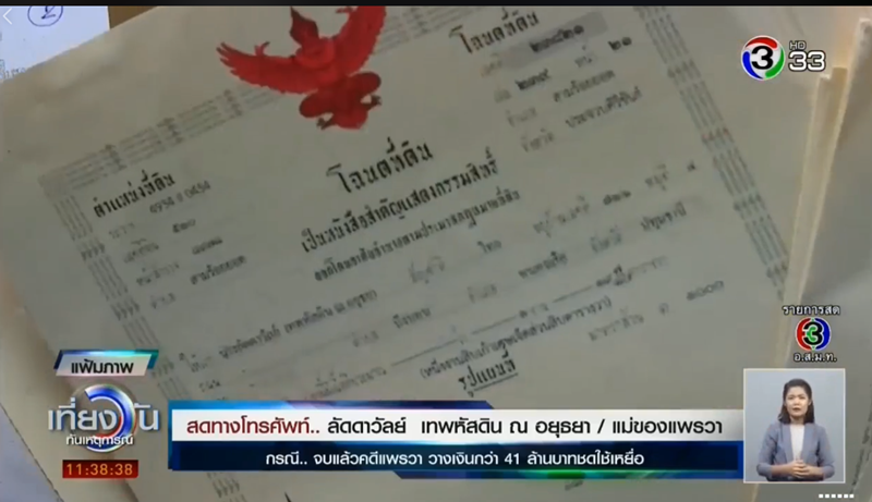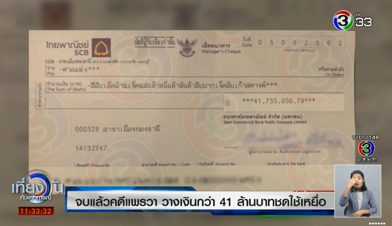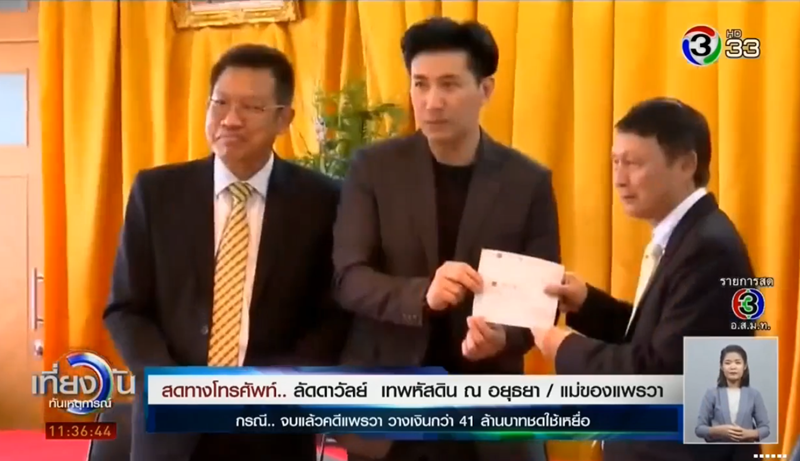 กำเนิดพลอย ผู้รับมอบอำนาจจากครอบครัว น.ส.แพรวา เทพหัสดิน ณ อยุธยา ได้นำแคชเชียร์เช็ค จำนวน 41,755,050.79 บาท พร้อมเงินค่าธรรมเนียมศาล