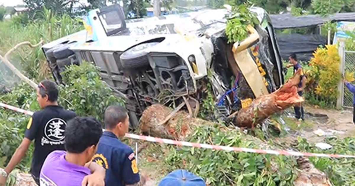 โชเฟอร์หลับใน ทำรถบัสทัศนศึกษาสวนสยามชนต้นไม้พลิกคว่ำ ดับ 1 เบื้องต้นตำรวจตั้งข้อหา 2 กระทง