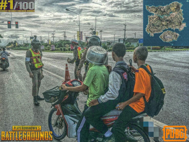 ซึ่งเป็นภาพของเด็กนักเรียนชาย 3 คน ที่ตกใจเมื่อเห็นด่านตำรวจ