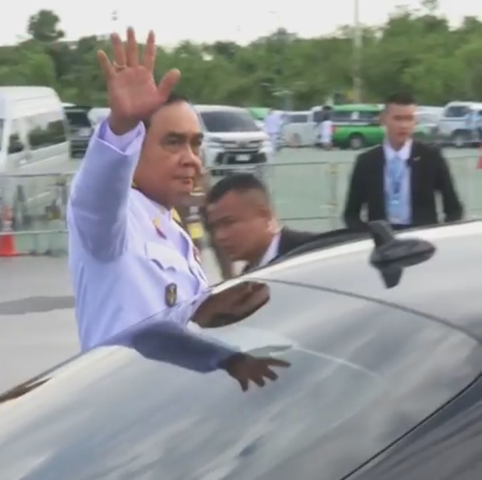 ก่อนโบกมือทักทายแล้วเดินขึ้นรถเดินทางออกจากมณฑลพิธีท้องสนามหลวง