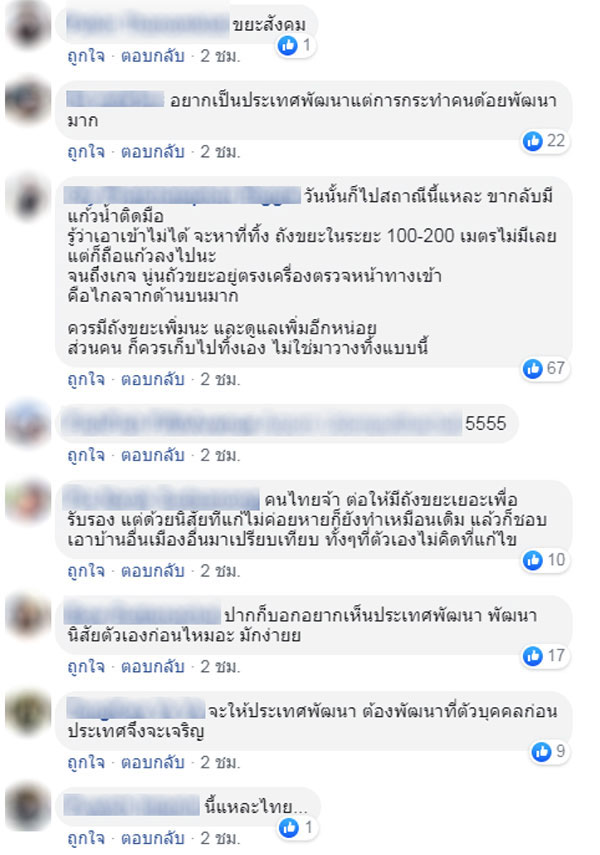 ขณะที่ชาวเน็ตหลังเห็นภาพดังกล่าวต่างเข้ามาแสดงความคิดเห็นมากมาย ส่วนใหญ่ไม่พอใจกับพฤติกรรมมักง่ายของคนบางส่วน และบอกว่า นี่แหละคนไทย ต่อให้มีถังขยะหรือไม่มี ด้วยนิสัยที่แก้ไม่ค่อยหายก็ยังทำเหมือนเดิม ปากก็บอกอยากเห็นประเทศพัฒนา แต่ตัวเองไม่คิดที่จะแก้ไข