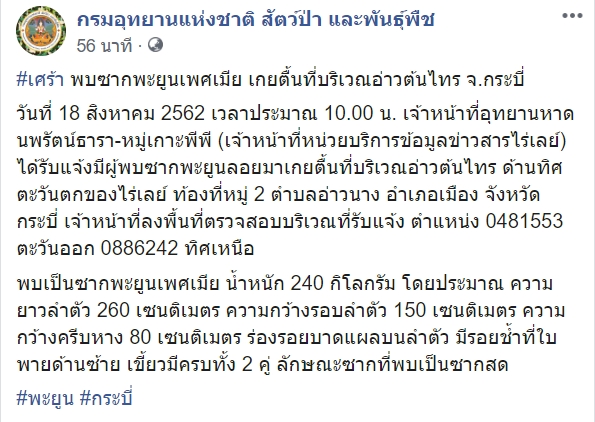 วันที่ 18 สิงหาคม 2562 เฟซบุ๊ก กรมอุทยานแห่งชาติ สัตว์ป่า และพันธุ์พืช รายงานว่า เวลาประมาณ