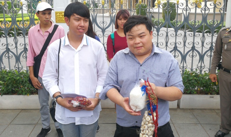 กรณีเมื่อวันที่ 2 กุมภาพันธ์ ที่ผ่านมา จำเลยทั้งสองพร้อมกลุ่มเพื่อนนักศึกษาเดินทางไปยังทำเนียบรัฐบาล เพื่อเชิญให้ พล.อ. ประยุทธ์ จันทร์โอชา นายกรัฐมนตรี ลาออกจากตำแหน่ง เพื่อให้การเลือกตั้งเสรี สุจริต และเป็นธรรม ก่อนฝากพริก เกลือ กระเทียม แขวนไว้บริเวณรั้วทำเนียบรัฐบาล โดยหลังถูกจับกุมจำเลยทั้งสองให้การปฏิเสธ