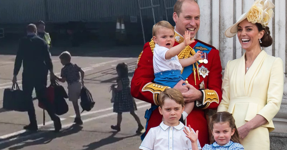 เจ้าชายวิลเลียม กับ เจ้าชายจอร์จ และ เจ้าหญิงชาร์ล็อต์ ทรงถือกระเป๋าสัมภาระด้วยพระองค์เอง ในขณะที่แคเธอรีนทรงอุ้มเจ้าชายหลุยส์ และทรงเดินตามไปอย่างใกล้ชิด