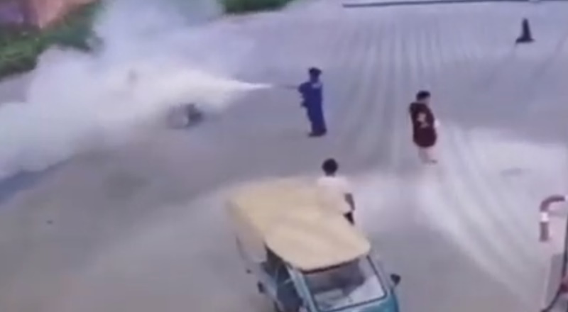 ชายจีนเมา ขี่มอเตอร์ไซค์เข้าไปจุดบุหรี่สูบในปั๊ม เจอพนักงานสาวคว้าถังดับเพลิงไล่ตามฉีดใส่ไม่ยั้ง ก่อนจับส่งตำรวจ