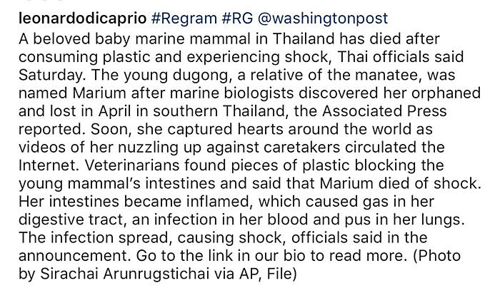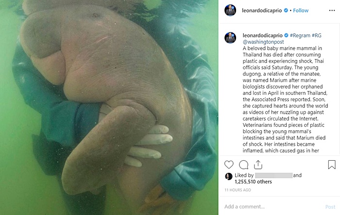 โดยลีโอนาร์โด ได้โพสต์รูปภาพของมาเรียม เมื่อครั้งอยู่ในอ้อมแขนทางเจ้าหน้าที่ที่ลงไปดูแลอย่างใกล้ชิด พร้อมทั้งยกรายงานบางส่วนของวอชิงตันโพสต์ มาเผย ระบุว่า มาเรียม พะยูนน้อย ในประเทศไทย ตายด้วยภาวะช็อก อันมีสาเหตุมาจากจากกินเศษขยะพลาสติก ทำให้ไปขวางลำไส้ จนมีอาการอุดตันและอักเสบ จนทำให้มีแก๊สสะสมในทางเดินอาหาร ส่งผลให้มีอาการติดเชื้อในกระแสเลือด และปอดเป็นหนอง