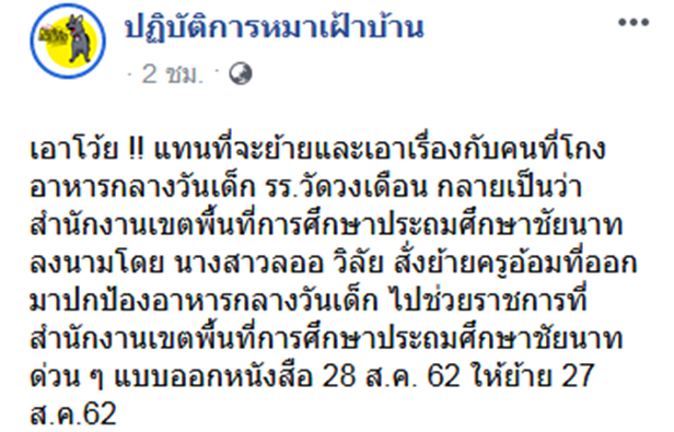 เพจดังเผย ครูอ้อม ถูกปาเลือด ปมแฉอาหารกลางวันให้เด็กกินผัดมาม่าเปล่า ๆ ถูก ผอ.สพป.ชัยนาท สั่งย้ายช่วยราชการด่วน ทำชาวเน็ตวิจารณ์สนั่นข้องใจ สั่งย้ายผิดคนหรือเปล่า