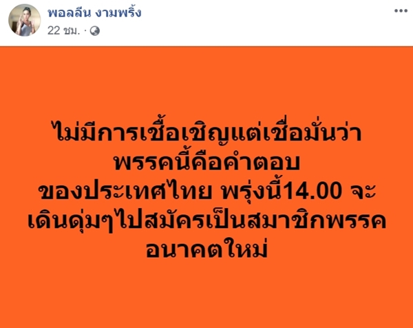 2562) ได้มีการโพสต์ข้อความผ่านทางเฟซบุ๊กว่า "ไม่มีการเชื้อเชิญแต่เชื่อมั่นว่าพรรคนี้คือคำตอบของประเทศไทย พรุ่งนี้