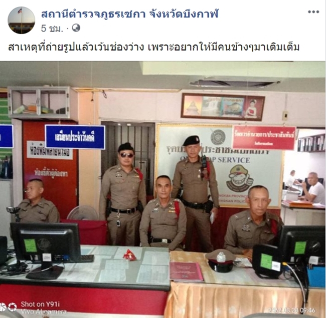 ขณะนี้ (28 สิงหาคม 2562) โลกโซเชียลได้มีการแห่แชร์แคปชั่นสุดพีคจากเฟซบุ๊กแฟนเพจ สถานีตำรวจภูธรเซกา จังหวัดบึงกาฬ ที่ทำเอาขำกันสนั่น เพราะว่าแอดมินได้โพสต์ภาพเจ้าหน้าที่ตำรวจ 5 นาย พร้อมแคปชั่นว่า "สาเหตุที่ถ่ายรูปแล้วเว้นช่องว่าง เพราะอยากให้มีคนข้าง ๆ มาเติมเต็ม"