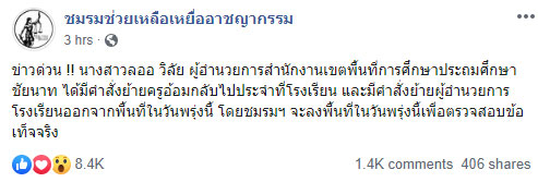 ข่าวด่วน !! นางสาวลออ วิลัย ผู้อำนวยการสำนักงานเขตพื้นที่การศึกษาประถมศึกษาชัยนาท ได้มีคำสั่งย้ายครูอ้อมกลับไปประจำที่โรงเรียน และมีคำสั่งย้ายผู้อำนวยการโรงเรียนออกจากพื้นที่ในวันพรุ่งนี้ โดยชมรมจะลงพื้นที่ในวันพรุ่งนี้เพื่อตรวจสอบข้อเท็จจริง
