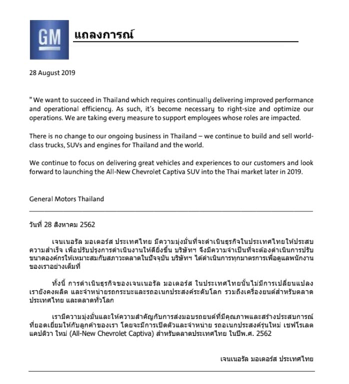 ทั้งนี้ การดำเนินธุรกิจของเจนเนอรัล มอเตอร์ส ในประเทศไทยนั้นไม่มีการเปลี่ยนแปลง เรายังคงผลิต และจำหน่ายรถกระบะและรถอเนกประสงค์ระดับโลก รวมถึงเครื่องยนต์สำหรับตลาดประเทศไทย และตลาดทั่วโลก