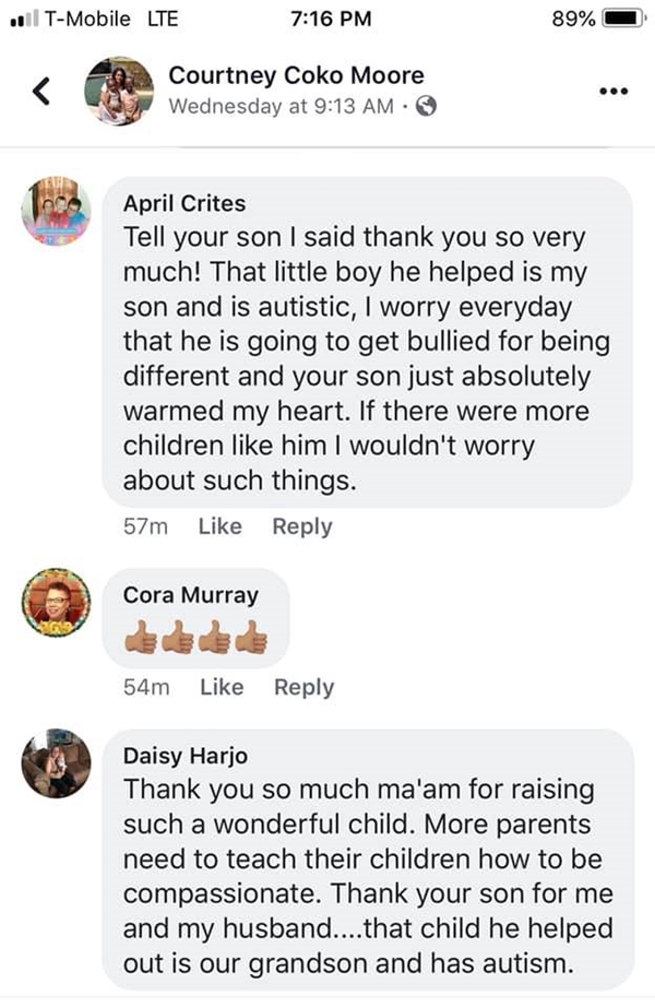 แม่ถึงกับร้องไห้ เมื่อได้เห็นเด็กชายผิวสีคนนี้ เข้าไปปลอบลูกชายออทิสติกที่กำลังร้องไห้ ในวันแรกที่โรงเรียน รับกลัวอยู่ตลอดว่าจะมีคนแกล้งลูก แต่ได้เห็นภาพนี้แล้วก็อุ่นใจ