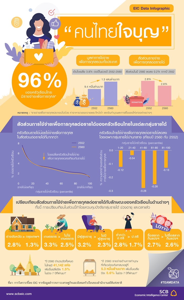 หากพูดถึงเรื่องความใจบุญ ชอบบริจาค เชื่อว่าคนไทยส่วนใหญ่ต้องเคยทำ โดยเมื่อวันที่ 30 สิงหาคม 2562 ศูนย์อีไอซี ธนาคารไทยพาณิชย์ ได้ทำการวิเคราะห์ข้อมูลการสำรวจภาวะเศรษฐกิจและสังคมครัวเรือนไทยในปี