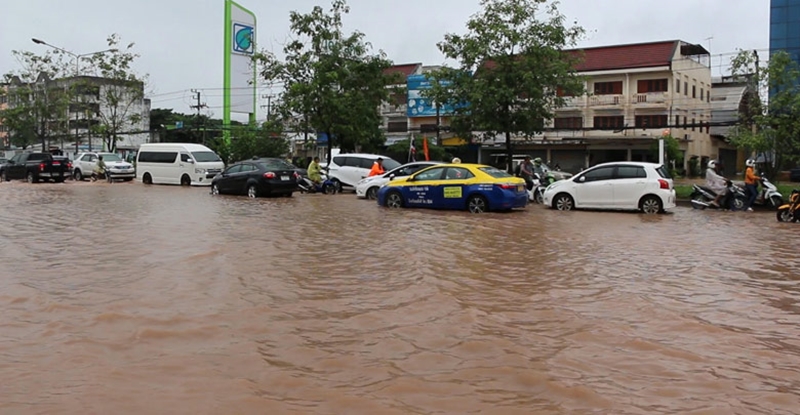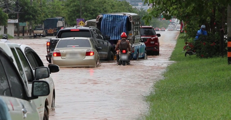 ขณะที่ถนนมะลิวัลย์ จ.ขอนแก่น น้ำท่วมขังตั้งแต่บริเวณด้านหน้ามหาวิทยาลัยขอนแก่น ไปจนถึงใกล้กับสี่แยกค่าย ร.8 เป็นระยะทางยาวประมาณ 1 กิโลเมตร