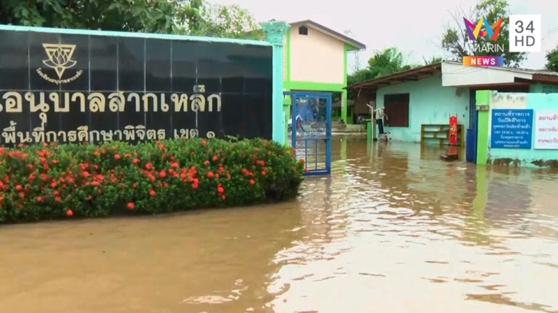 ภาพน้ำที่เอ่อล้นท่วมชุมชนในเขตเทศบาล ต.สากเหล็ก จ.พิจิตร กว่า 100 หลังคาเรือน โรงเรียนอนุบาลสากเหล็ก ต้องประกาศปิด 2 วัน