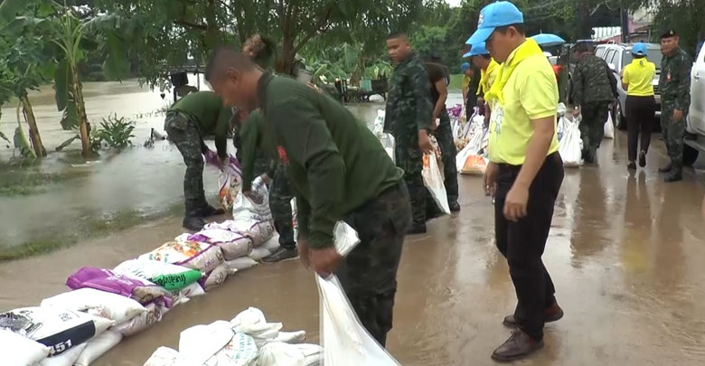 เร่งนำกระสอบทรายขนย้ายไปกั้นน้ำตามจุดต่าง ๆ ซึ่งเป็นพื้นที่เสี่ยง