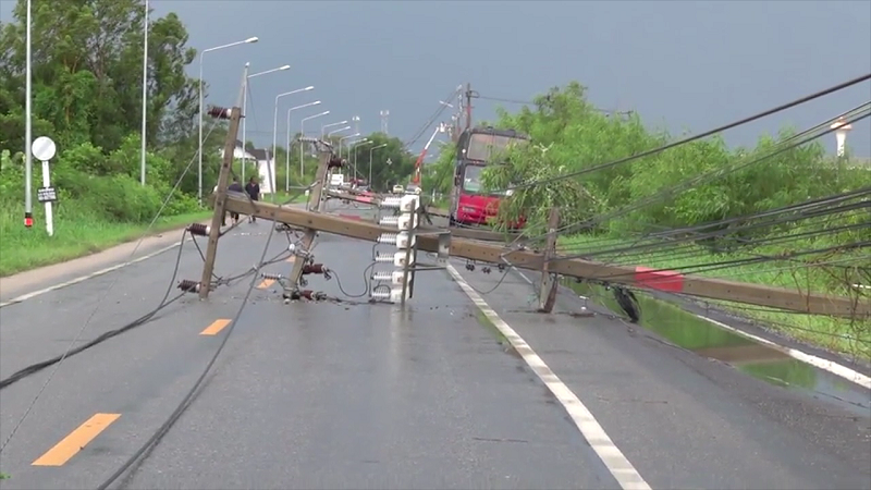 ต.หนองจอก มีคนในรถอยู่ 5 คน ซึ่งเจ้าหน้าที่ต้องตัดไฟก่อนถึงเข้าช่วยเหลือได้อย่างปลอดภัย โดยรวมแล้วมีเสาไฟฟ้าล้มทั้งหมด 16 ต้น