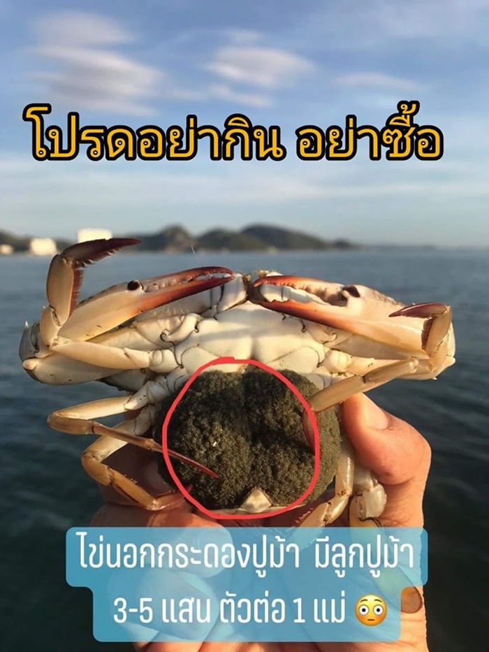 โซเชียลแชร์ขอความร่วมมือวอนอย่ากินปูไข่นอกกระดอง เพราะมีไข่ที่ได้รับการผสมพันธุ์ พร้อมที่จะเกิดเป็นลูกปูหลายแสนตัว ชี้ได้ไม่คุ้มเสีย แถมรสชาติไม่อร่อย
