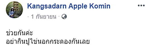 พร้อมข้อความขอให้ชาวเน็ตช่วยกันอย่ารับประทานไข่ปูนอกกระดอง