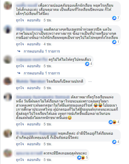 โดยทางเพจได้วอนขอให้โรงเรียนสั่งหยุดเรียนไปก่อน เพื่อความปลอดภัยของเด็ก ๆ ระบุข้อความว่า "แฟนเพจส่งภาพฝากเตือนน้อง ๆ ที่ไปโรงเรียนในเขตที่มีน้ำท่วม จากอำนาจเจริญ หยุดให้เด็กเถอะครับ ไม่ไปโรงเรียนไม่กี่วันเด็กคงไม่โง่ ไม่สงสารเด็กกันเหรอครับ ขนาดรถใหญ่ยังผ่านไปมายาก แล้วเด็กที่ได้เอามอเตอร์ไซค์มาจะลำบากขนาดไหน ไม่ห่วงเด็กเลยเหรอ สักแต่จะให้เด็กไปโรงเรียน หรือว่าต้องให้เกิดอุบัติเหตุก่อนถึงจะสั่งหยุดโรงเรียนได้ #ที่นี่อำนาจเจริญ #ภาพเมื่อเช้าสดๆ"