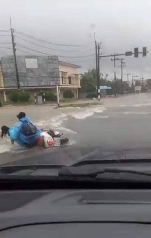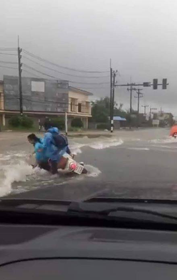 ขี่รถจักรยานยนต์ฝ่าน้ำท่วมเพื่อไปโรงเรียน สุดท้ายต้องล้มคว่ำไม่เป็นท่า