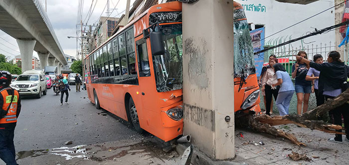 โดย น.ส.ธัญชนก ผู้โดยสารที่ประสบเหตุ เปิดเผยว่า ก่อนเกิดเหตุรถเมล์คันนี้ขับค่อนข้างเร็ว กระทั่งรถพุ่งขึ้นบนทางเท้าชนเข้ากับต้นไม้ เสาไฟฟ้า และพุ่งชนเข้าตอม่อสะพานลอยอย่างแรง ตนตั้งสติได้ก็ใช้มือจับราวเหล็กไว้ จึงไม่เป็นอะไรมาก แต่ผู้โดยสารคนอื่นที่นั่งอยู่ส่วนท้ายหลายคนพุ่งตกจากที่นั่ง กระเด็นไปตามแรงเหวี่ยง ส่วนตนตกใจมาก หลังจากนี้ตั้งใจว่าจะไม่นั่งรถเมล์อีกแล้ว เพราะรู้สึกไม่ปลอดภัย
