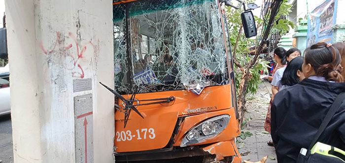 รถเมล์สาย 203 พุ่งชนตอม่อสะพานลอย ย่านพระราม 7 ผู้โดยสารเจ็บระนาว กระเป๋ารถเมล์อ้างเข้าเกียร์แล้วรถกระตุก จนเสียหลักเกิดอุบัติเหตุ ผู้โดยสารเข็ด ลั่นจะไม่นั่งรถเมล์อีก - พบเป็นรถเมล์ที่จ่อขึ้นค่าโดยสาร