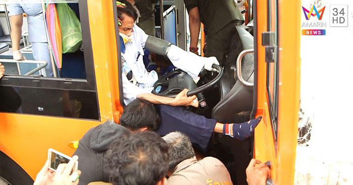 ทั้งนี้ มีผู้โดยสารบาดเจ็บ 8 คน ส่วนใหญ่หัวกระแทกรถจนปูดโน หน้าผากแตก แขน-ขาได้รับบาดเจ็บเล็กน้อย เจ้าหน้าที่กู้ภัยช่วยกันพาผู้โดยสารออกทางหน้าต่าง ขณะที่นายธงชัย คร้ามทิม คนขับรถเมล์ ติดค้างอยู่ภายในรถ เนื่องจากขาซ้ายถูกบีบอัดระหว่างเบาะนั่งและพวงมาลัย เจ้าหน้าที่ต้องใช้เครื่องตัดถ่างช่วยนำตัวออกมาและส่งโรงพยาบาล