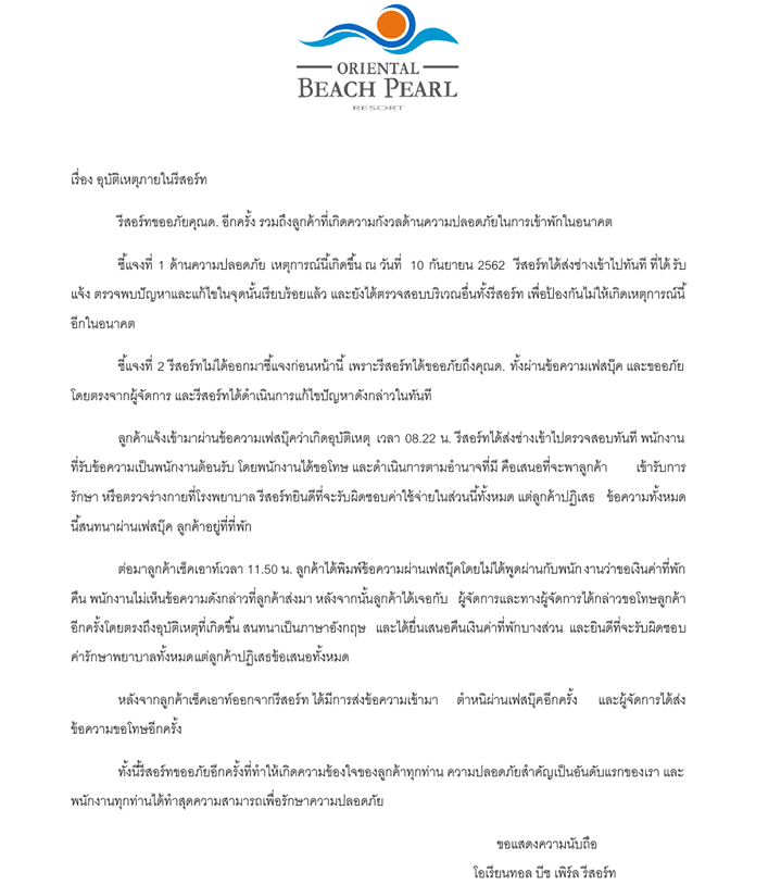 คืบหน้า วันที่ 11 กันยายน 2562 ทาง โอเรียนทอล บีช เพิร์ล รีสอร์ต ได้ชี้แจงถึงกรณีดังกล่าวว่า ทางรีสอร์ตขออภัย คุณ ด. อีกครั้ง