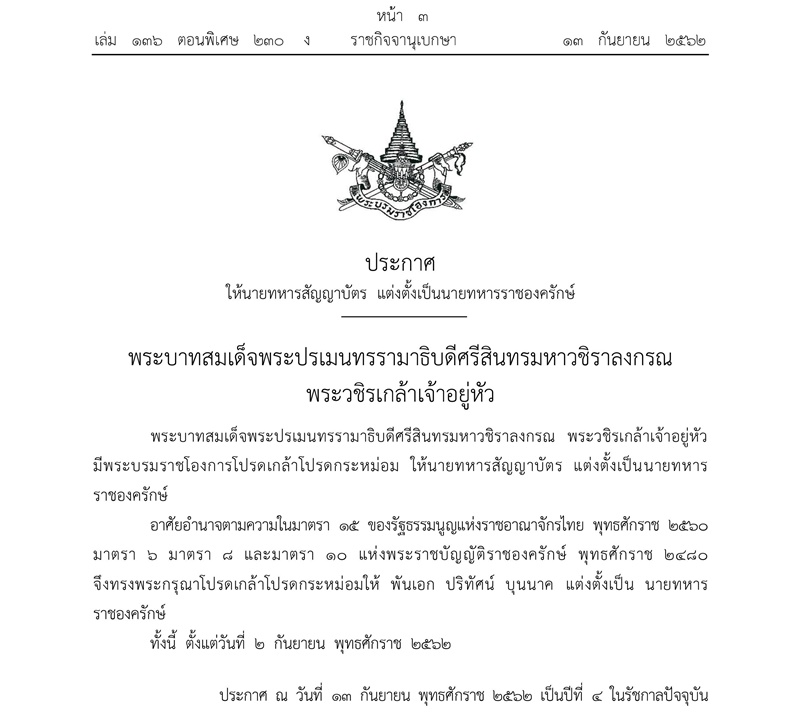 เมื่อวันที่ 13 กันยายน 2562 เว็บไซต์ ราชกิจจานุเบกษา แจ้งประกาศราชกิจจานุเบกษาของ พระบาทสมเด็จพระปรเมนทรรามาธิบดีศรีสินทรมหาวชิราลงกรณ พระวชิรเกล้าเจ้าอยู่หัว ระบุว่า พระบาทสมเด็จพระเจ้าอยู่หัว มีพระบรมราชโองการโปรดเกล้าโปรดกระหม่อมแต่งตั้งให้นายทหารสัญญาบัตร เป็นนายทหารราชองครักษ์
