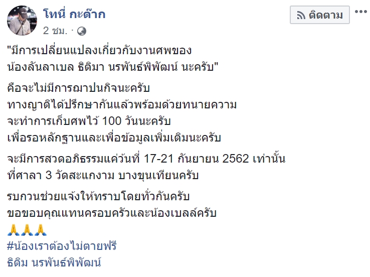 วันที่ 18 กันยายน 2562 เฟซบุ๊ก โทนี่ กะต๊าก ซึ่งเป็นเพื่อนของนางสาวธิติมา นรพันธ์พิพัฒน์ หรือ ลัลลาเบล พริตตี้สาวเซ็กซี่ ที่เสียชีวิตปริศนา ได้มีการโพสต์ข้อความระบุว่า ทางครอบครัวของลัลลาเบล จะมีการเลื่อนพิธีฌาปนกิจไปก่อน โดยจะมีการสวดพระอภิธรรมในวันที่ 17-21 กันยายน 2562 ที่วัดสะแกงาม บางขุนเทียน แล้วจะทำการเก็บศพไว้ 100 วัน ทั้งนี้ เพื่อรอผลการชันสูตรพลิกศพ และหลักฐานอื่น ๆ เกี่ยวกับคดี