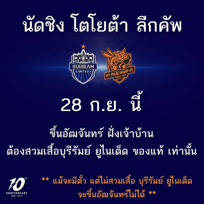 เมื่อวันที่ 24 กันยายน 2562 เฟซบุ๊ก BURIRAM UNITED ของสโมสรฟุตบอลบุรีรัมย์ ยูไนเต็ด มีการโพสต์ภาพกฎการเชียร์ของทีม ในนัดชิงชนะเลิศฟุตบอลโตโยต้า ลีกคัพ วันที่ 28 กันยายน นี้ ระหว่างบุรีรัมย์ ยูไนเต็ด พบ พีที ประจวบ เอฟซี ว่า ต้องสวมเสื้อบุรีรัมย์ของแท้เท่านั้น หากไม่สวมเสื้อจะไม่อนุญาตให้ขึ้นอัฒจันทร์ฝั่งเจ้าบ้าน