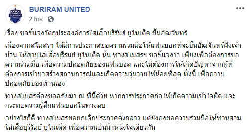 บุรีรัมย์ ยูไนเต็ด โดนวิจารณ์ยับ ให้แฟนบอลใส่เสื้อแท้เชียร์ มิเช่นนั้นไม่ให้เข้าสนาม ก่อนโพสต์ชี้แจง แต่แฟนบอลก็ยังคงวิจารณ์อย่างต่อเนื่อง