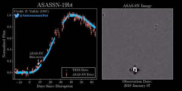 ปรากฏการณ์ดังกล่าวได้รับการตั้งชื่อว่า ASASSN-19bt โดยกล้อง TESS ตรวจพบได้เป็นครั้งแรกในวันที่ 29 มกราคม 2562 และได้ติดตามเรื่อยมาก กระทั่งตรวจพบว่าช่วงเวลามาถึงจุดพีค ซึ่งเป็นช่วงที่แสงส่องสว่างมากที่สุดคือ วันที่ 4 มีนาคม 2562