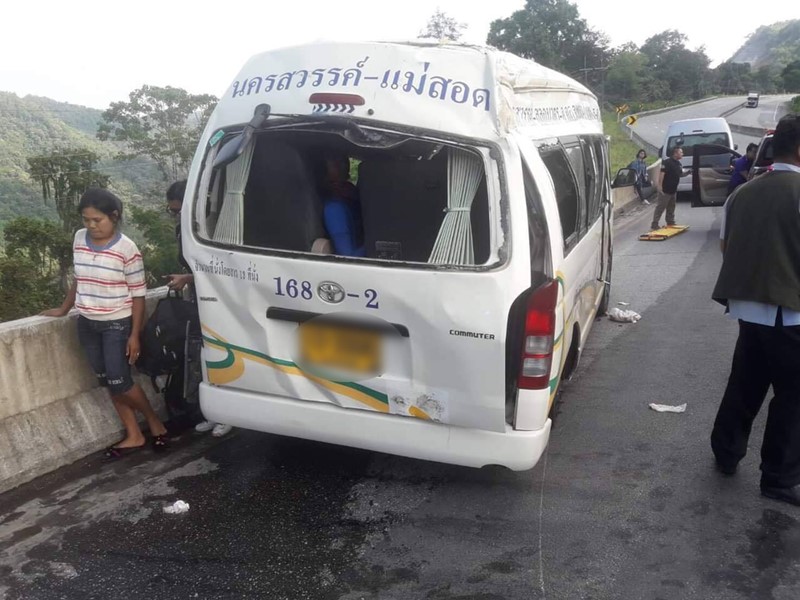 เกิดอุบัติเหตุ รถตู้โดยสารขนผู้โดยสาร 14 ชีวิต พุ่งชนขอบทางก่อนพลิกคว่ำบนถนนสายแม่สอด-ตาก เผยผู้บาดเจ็บสาหัส 5 ราย คาดสาเหตุรถยางระเบิด