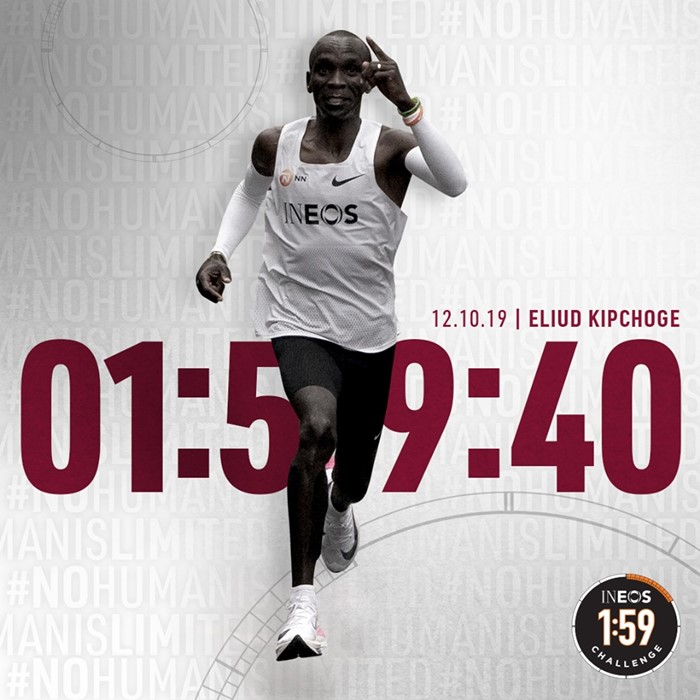 ทำลายกำแพงการวิ่งมาราธอนที่เวลาต่ำกว่า 2 ชั่วโมง โดยมีการติดแฮชแท็ก #nohumanislimited ในโซเชียล