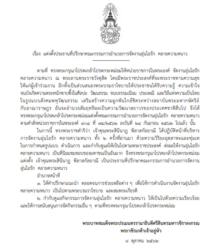 รัชกาลที่ 10 โปรดเกล้าฯ แต่งตั้ง เจ้าคุณพระสินีนาฏ พิลาสกัลยาณี เป็นประธานที่ปรึกษาคณะกรรมการอำนวยการจัดงานอุ่นไอรัก - โครงการจิตอาสาพระราชทาน