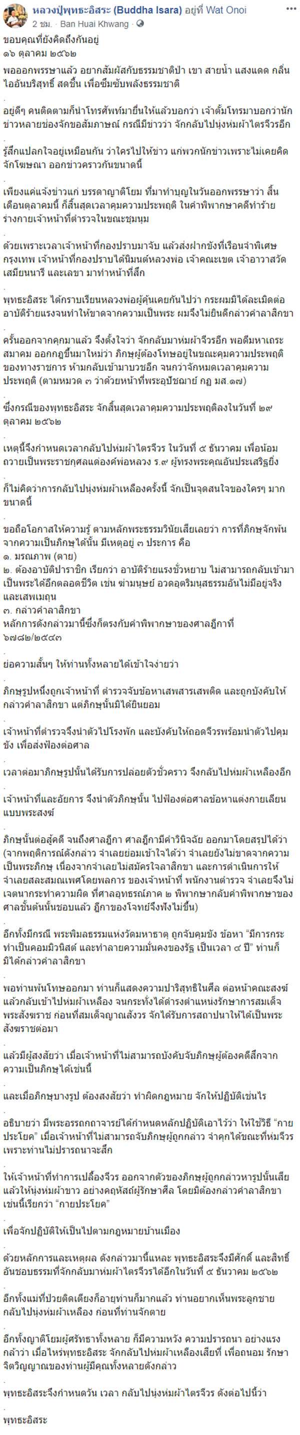 ล่าสุด (16 ตุลาคม 2562) มีรายงานว่า อดีตพระพุทธะอิสระ ได้โพสต์ข้อความชี้แจงเกี่ยวกับเรื่องดังกล่าวลงในเฟซบุ๊ก หลวงปู่พุทธะอิสระ (Buddha Isara) ระบุว่า รู้สึกแปลกใจ ไม่คิดว่าการกลับไปห่มผ้าเหลืองครั้งนี้ จะเป็นจุดสนใจของใคร ๆ มากขนาดนี้ ส่วนเรื่องที่เตรียมกลับมาห่มผ้าไตรจีวร เพราะตอนที่ถูกจำคุกคดีทำร้าย ร่างกายเจ้าหน้าที่ตำรวจในขณะชุมนุม ตอนนั้นเจ้าหน้าที่กองปราบได้นิมนต์หลวงพ่อ เจ้าคณะเขต เจ้าอาวาสวัดเสมียนนารี และเลขา มาทำหน้าที่สึก แต่ตนชี้แจงไปว่า ไม่ได้ละเมิดต่ออาบัติร้ายแรงจนทำให้ขาดจากความเป็นพระ จึงไม่ยินดีกล่าวคำลาสิกขา