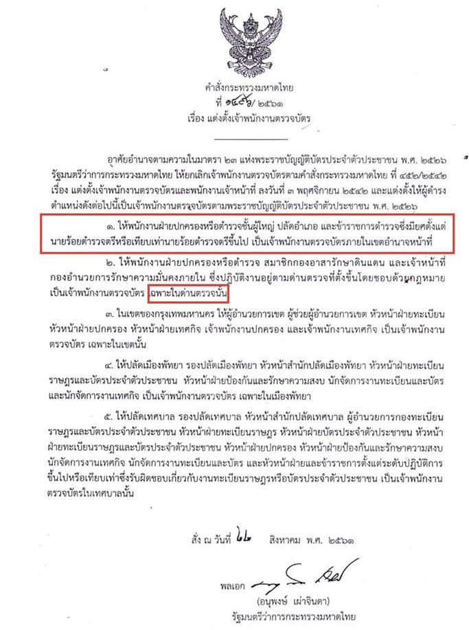 โดยคำสั่งกระทรวงมหาดไทย ให้อาศัยอำนาจพระราชบัญญัติบัตรประจำตัวประชาชน แต่งตั้งให้ผู้ดำรงตำแหน่งต่อไปนี้มีสิทธิ์ตรวจบัตรประชาชน