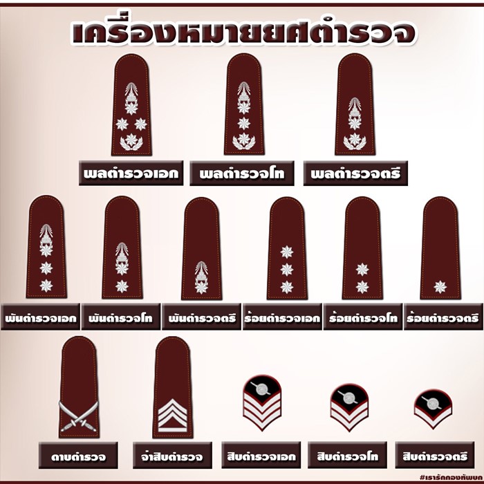การดูยศของเจ้าหน้าที่ตำรวจ สามารถดูจากเครื่องหมายยศบนบ่าดังภาพต่อไปนี้