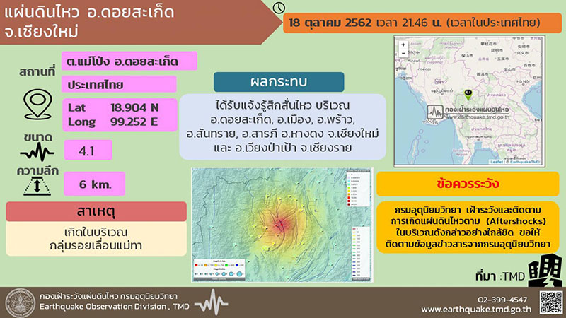 วันที่ 18 ตุลาคม 2562 กองเฝ้าระวังแผ่นดินไหว กรมอุตุนิยมวิทยา รายงานว่า เวลา 21.46 น. เกิดเหตุแผ่นดินไหวที่ ต.แม่โป่ง อ.ดอยสะเก็ด จ.เชียงใหม่ ขนาด 4.1 ความลึก 6 กิโลเมตร