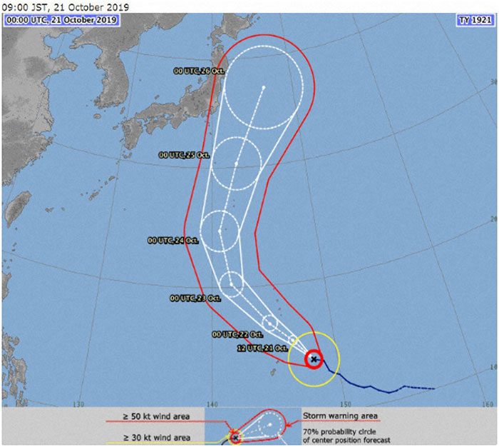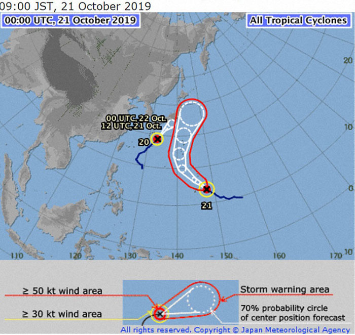 ขณะที่ไต้ฝุ่นอีกลูก ไต้ฝุ่นบัวลอย พายุลำดับที่ 21 ในเวลา 09.00 น. ของวันที่ 21 ตุลาคม ไต้ฝุ่นอยู่ทางตะวันออกของหมู่เกาะมาเรียนา ในมหาสมุทรแปซิฟิก และเคลื่อนตัวไปทางตะวันตกเฉียงเหนือด้วยความเร็วประมาณ 30 กิโลเมตรต่อชั่วโมง ความเร็วลมใกล้ศูนย์กลาง 126 กิโลเมตรต่อชั่วโมง และความเร็วลมสูงสุด 180 กิโลเมตรต่อชั่วโมง โดยมีแนวโน้มว่าจะซัดเข้าชายฝั่งหมู่เกาะโองาซาวาระ ในช่วงวันที่ 24-25 ตุลาคม และอ่อนกำลังลงเข้าสู่ภูมิภาคคันโต ในวันที่ 26 ตุลาคม