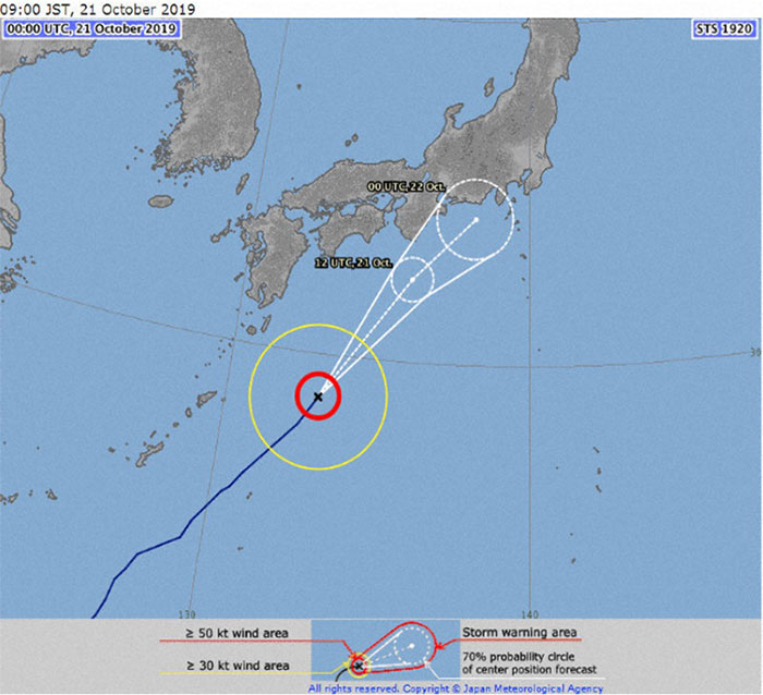 วันที่ 21 ตุลาคม 2562 เว็บไซต์ The Mainichi ของญี่ปุ่น เผยรายงานว่า กรมอุตุนิยมวิทยาญี่ปุ่นมีคำเตือนว่า มีความเป็นไปได้ที่อาจจะเกิดพายุฝนฟ้าคะนอง แผ่นดินถล่ม และน้ำท่วมในพื้นที่ราบต่ำและพื้นที่ริมแม่น้ำทางชายฝั่งมหาสมุทรแปซิฟิก ตั้งแต่ช่วงเย็นของวันที่ 21-22 ตุลาคม เนื่องจากพายุไต้ฝุ่นนอกูรี (Neoguri) กำลังเคลื่อนที่ไปยังภูมิภาคดังกล่าว ขณะเดียวกัน พายุอีกลูก ได้แก่ ไต้ฝุ่นบัวลอย (Bualoi) ก็กำลังมุ่งหน้าไปยังชายฝั่งตะวันออกของประเทศด้วยเช่นเดียวกัน