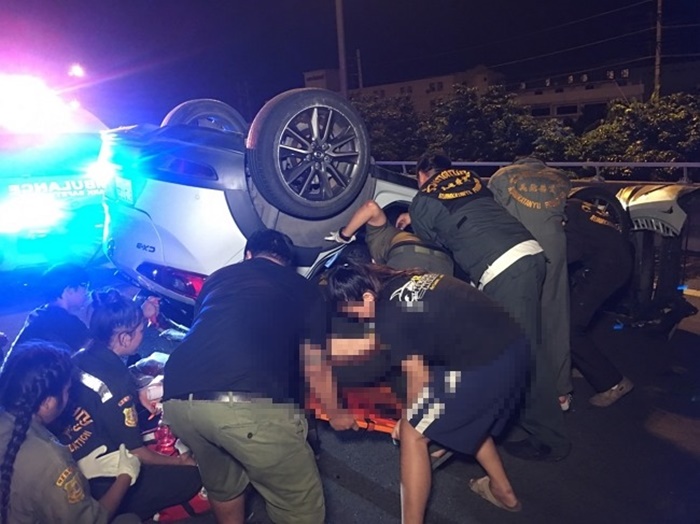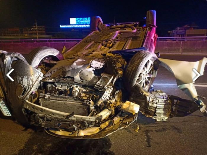 9-2 ในที่เกิดเหตุพบรถยนต์มาสด้า CX-3 เสียหลักพลิกคว่ำ สภาพพังยับเยิน